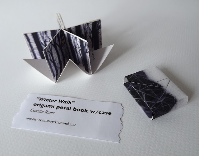 "Winter Walk" -- It may be March and spring in some areas of the world but at my house it is the time for the biggest snows. I made this miniature artist book to embrace the snows of March. The digital images inside the book are based on one of my original linocuts about the peace of the woods at night called, "Forest Bedroom." While the wind may be cold, it can be quite magical to walk under the moon through the trees on a snowy night. Inside the book is a poem I wrote inspired by South Dakota winters and the work of poet Robert Frost. An excerpt reads, “Breath curls from under hoods. Downy flakes melt on Cheeks. Tracks wander in the quiet whiteness.” --Camille RinerIt's lovely!
