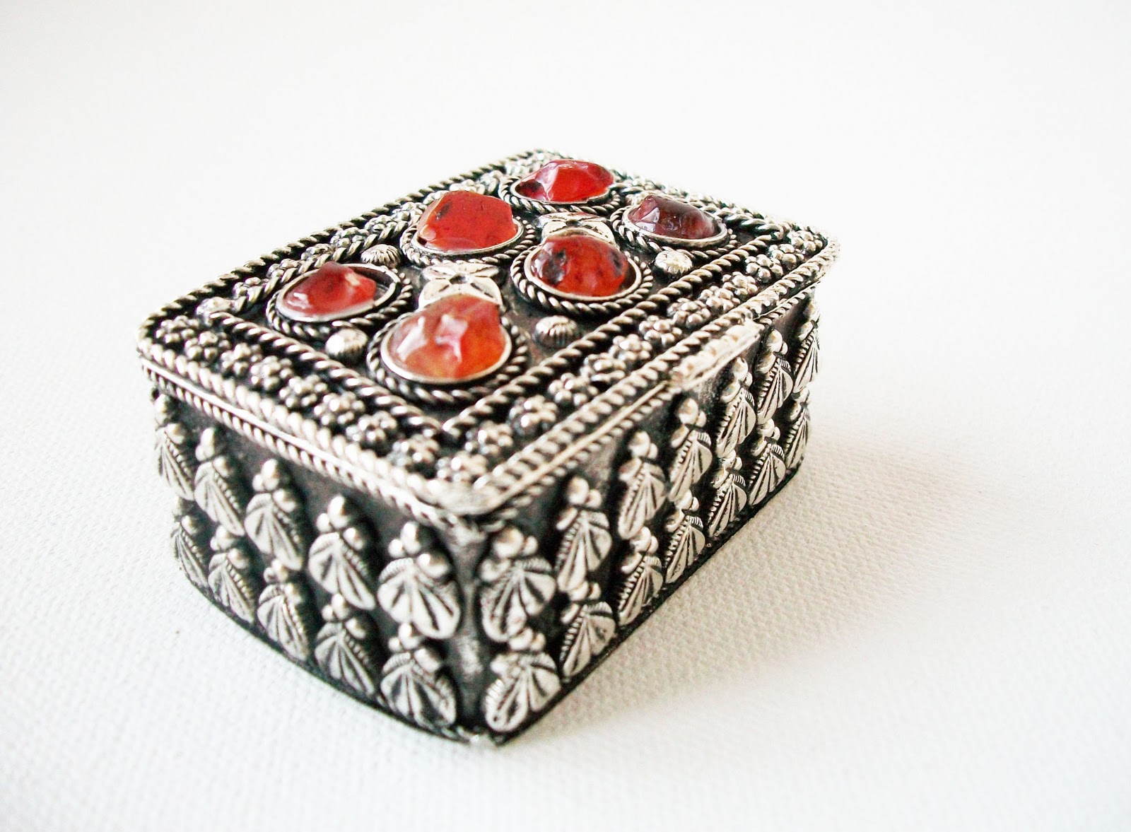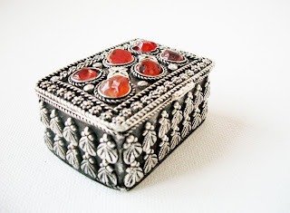 I made a book necklace a few weeks ago from a charm I found at a tiny local jewelry store (the same, in fact, which supplies all the silk cords for my necklaces) and when my sister suggested it would go perfectly as a Life of Pi themed necklace, I agreed immediately. At the same store, called Moonstones (shown over there <--) I found a little jewelry box that matched it serendipitously and was made in India--perfectly reflecting Life of Pi!